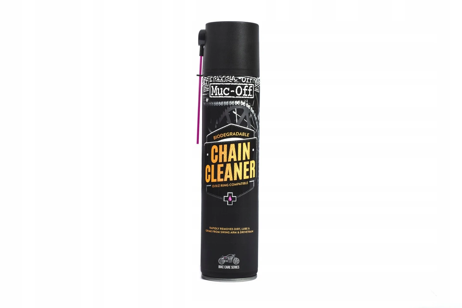 Biodegradowalny spray do czyszczenia łańcucha MUC-OFF. MUC-OFF to firma zapewniająca produkty do kompleksowej pielęgnacji kasków, motocykli. Szeroka gama produktów dla niemal wszystkich narażonych na zużycie elementów, pozwala na ich maksymalną ochronę i konserwację.