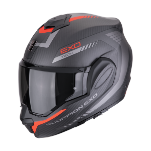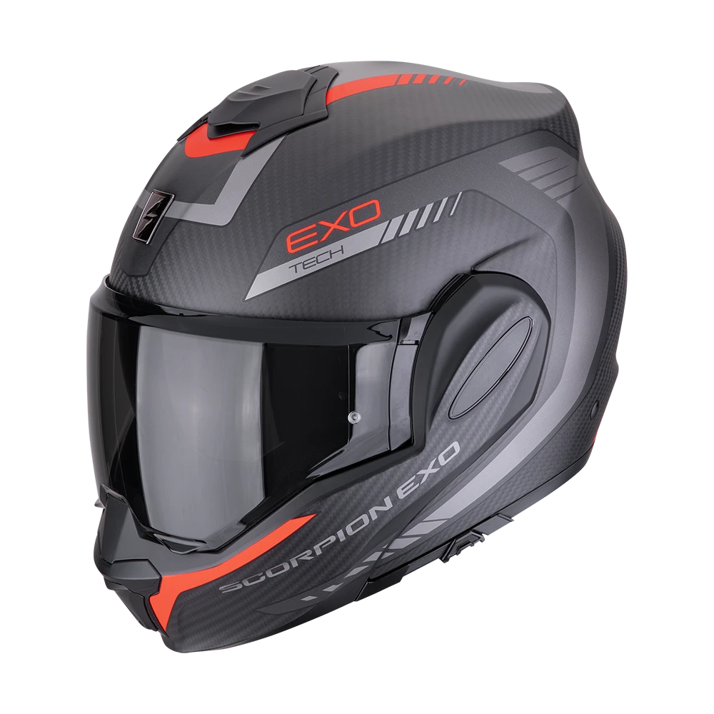 Scorpion Exo-Tech szczękowy kask, którego szczękę można obrócić do tyłu. Skorupa wykonana jest z włókna węglowego i szklanego. Wnętrze kasku Exo-Tech zbudowane jest z wyjmowanej wyściółki, którą można wyprać. Kask posiada regulowaną blendę przeciwsłoneczną z filtrem UV. Wizjer obsługuje Pinlock dopasowany idealnie do wielkości wizjera. Wizjer wykonany jest z materiału odpornego na zarysowania. KASK POSIADA PODWÓJNĄ HOMOLOGACJĘ (na jazdę w zamkniętej i otwartej szczęce).