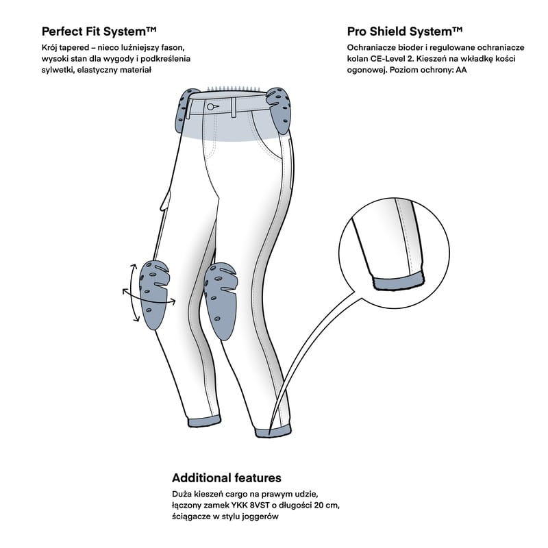 - Ściągacze w nogawkach (jogger fit) – lepsze dopasowanie do obuwia motocyklowego.