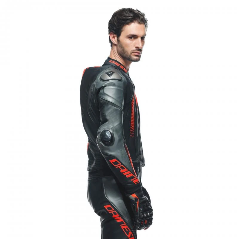 Laguna Seca 5 2PCS, wykonana w całości ze skóry bydlęcej tutu, to kwintesencja sportowej jazdy. Wyposażona w system zapinania w pasie pomiędzy kurtką a spodniami, jest pierwszym dwuczęściowym modelem, w którym zastosowano rozciągliwą wkładkę Tri-Axial. Tył, który w połączeniu z wstawkami z elastycznej tkaniny S1 i elastycznymi wstawkami ze skóry Microelastic 2.0 zapewnia poziom ergonomii i mobilności, jakiego nigdy wcześniej nie osiągnięto. Maksymalna ochrona wynika z bezpośredniego doświadczenia na torze i jest gwarantowana przez certyfikowane kompozytowe ochraniacze na ramionach, łokciach i kolana, miękkie protektory Pro-Shape 2.0 na biodrach oraz wyjmowane suwaki na łokciach (RSS). Obecność wymiennych aluminiowych nakładek na ramionach i łokciach zapewnia większą odporność na przetarcia stawów w przypadku upadku, ułatwiając ślizganie.
