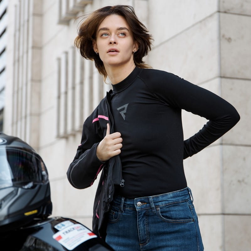 - wysoka zawartość włókien elastycznych oraz stref kompresyjnych ułatwia zakładanie odzieży motocyklowej