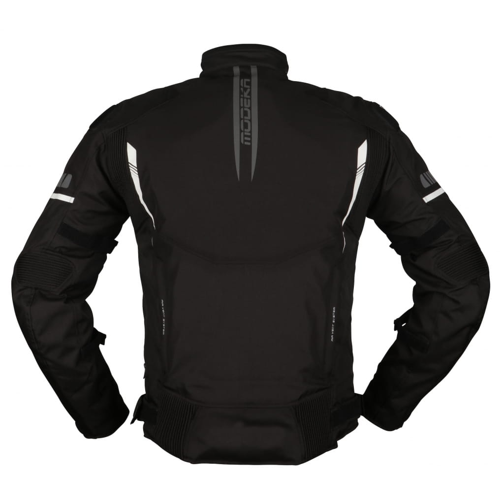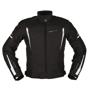 Męska kurtka motocyklowa w sportowym stylu. Uszyta z połączenia poliestru z wytrzymałym materiałem Ripstop. Jest wyposażona w niezbędne protektory (barki, łokcie) oraz w wypinaną membranę wodoodporną Humax®