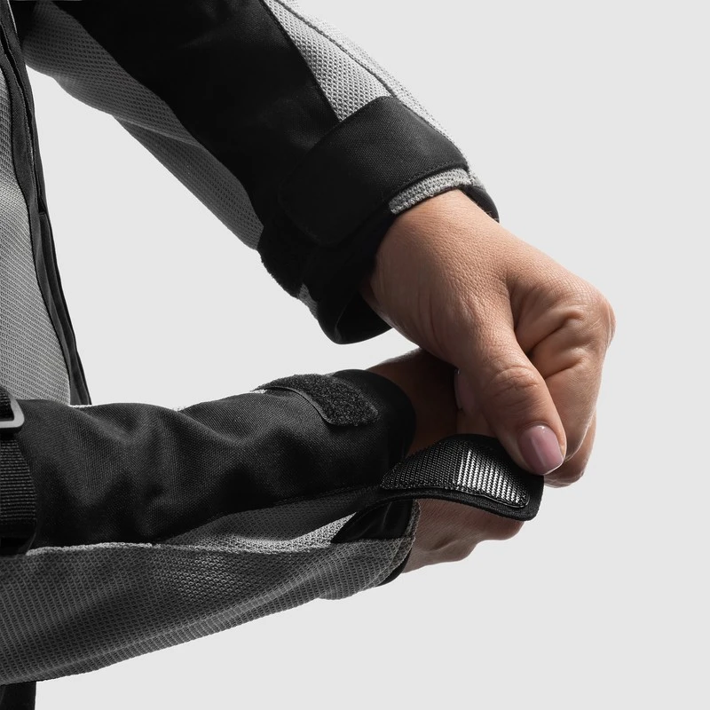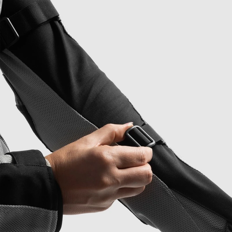 - Regulacja dopasowania: biceps (paski), mankiety, przedramiona (paski), talia (dla lepszego dopasowania ochraniacza pleców).