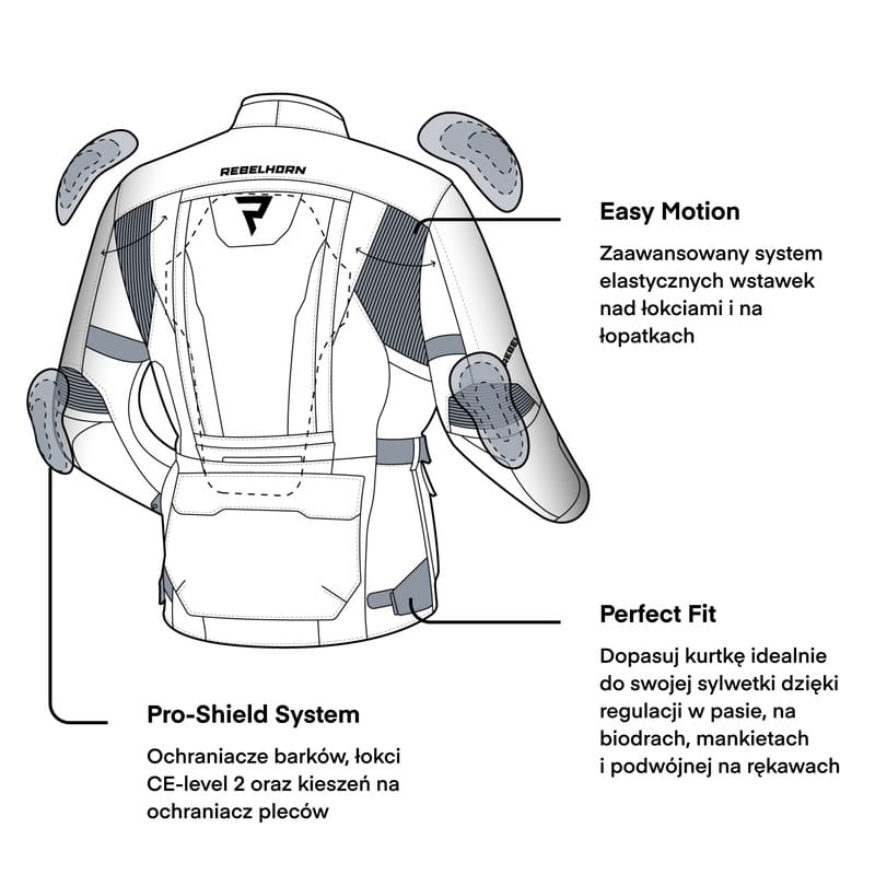 O Twoje bezpieczeństwo dbają: komplet ochraniaczy (barki, łokcie, plecy), wzmocnienia newralgicznych stref z materiału Hitena® Dobby Ballistic oraz odblaskowe wstawki i wymienne panele fluo.
