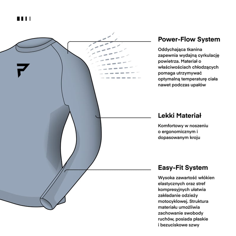 - wysoka zawartość włókien elastycznych oraz stref kompresyjnych ułatwia zakładanie odzieży motocyklowej
