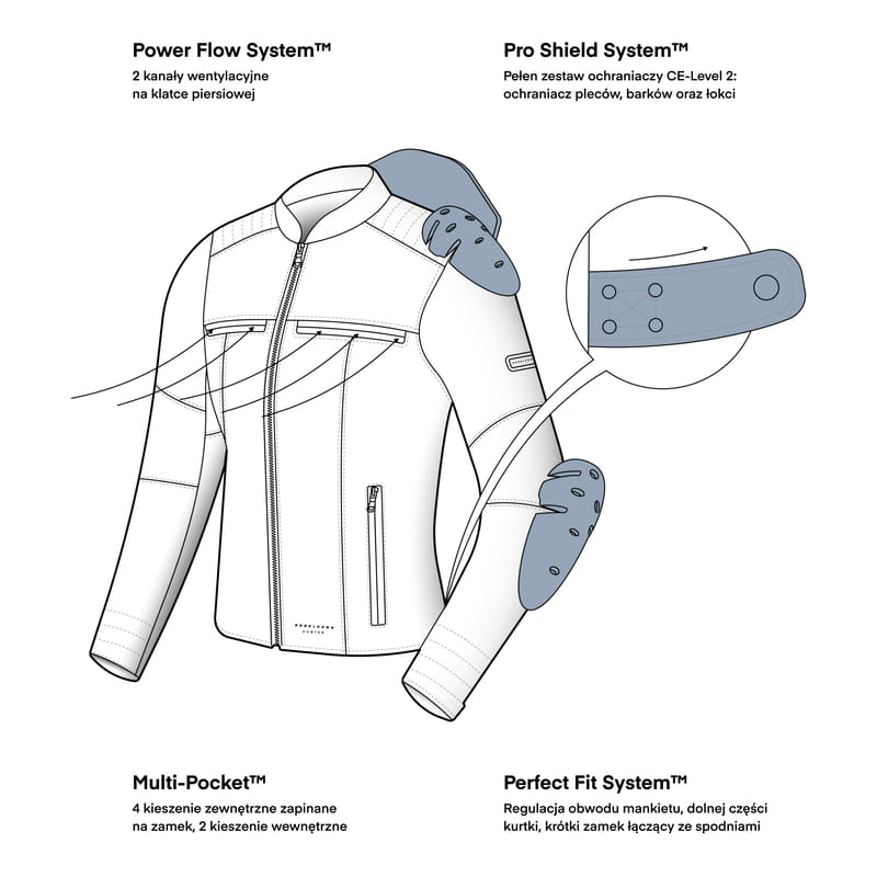Kurtka oferuje nie tylko bezpieczeństwo, ale również wygodę i praktyczne rozwiązania. Krótki zamek łączący umożliwia połączenie kurtki ze spodniami, co zapobiega podwijaniu się kurtki podczas jazdy. Dodatkowe paski do spięcia ze spodniami to kolejna funkcjonalność, dbająca o kompleksowe bezpieczeństwo.