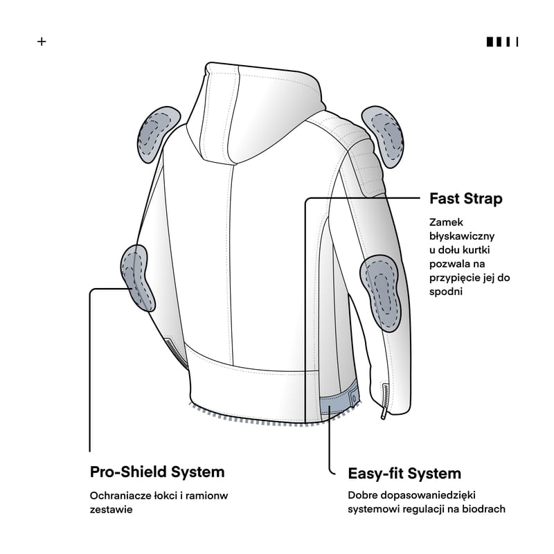 - Fast Strap – zamek błyskawiczny w dolnej części kurtki pozwala na spięcie jej ze spodniami
