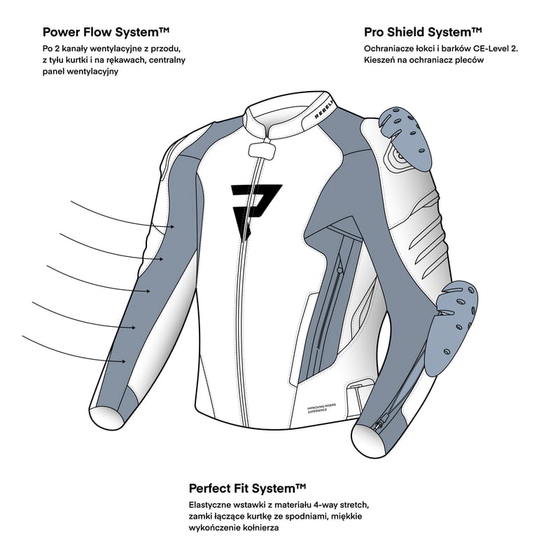 Za Twoje bezpieczeństwo odpowiadają ochraniacze poziomu 2 oraz odblaskowe elementy.