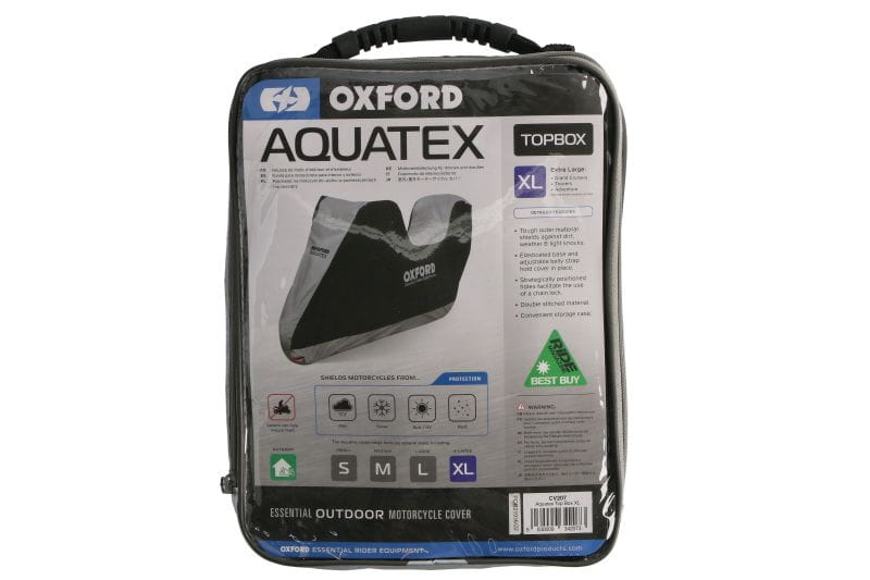 Wodoodporny pokrowiec Oxford Aquatex został zaprojektowany do użytku zewnętrznego, jak i wewnętrznego. Chroni motocykl przed warunkami atmosferycznymi i kurzem. Podwójnie szyty poliester zapewnia wytrzymałość i trwałość. Zastosowano specjalny ściągacz zachodzący za przednie koło i przytrzymujący pokrowiec we właściwym miejscu. Ponadto zapewnia dobre dopasowanie, a znajdujący się od spodu pasek pomaga w utrzymaniu pokrowca przy silnych wiatrach.