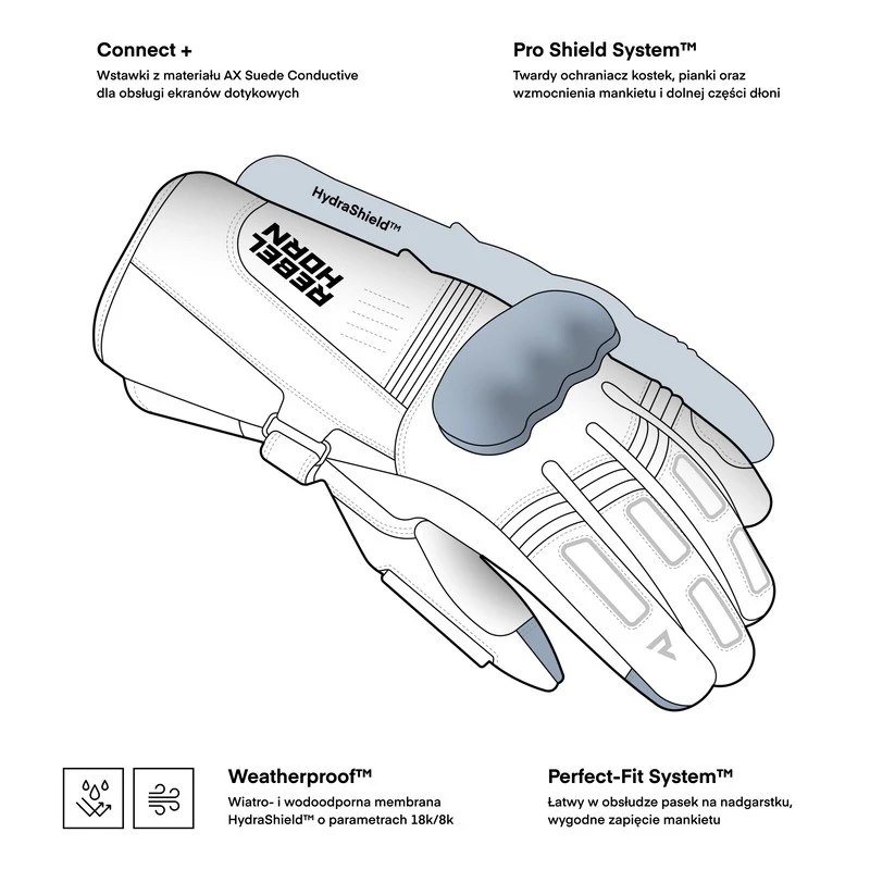 Wodoodporne rękawice motocyklowe Rebelhorn Tracer WP są przeznaczone dla miłośników turystyki motocyklowej, poszukujących lekkich i funkcjonalnych akcesoriów. Posiadają ergonomicznie zaprojektowaną wycieraczkę wizjera, która wraz z wodoodporną membraną HydraShieldTM zapewnia komfort jazdy w deszczowych warunkach. Za bezpieczeństwo odpowiadają twarde ochraniacze kostek oraz pianki i wzmocnienia na dłoni oraz na mankietach. Dodatkowo, rękawice Tracer WP zostały wyposażone we wstawki ze skóry AX Conductive, dzięki której idealnie nadają się do obsługi urządzeń dotykowych, zapewniając wygodę i funkcjonalność w każdych warunkach.