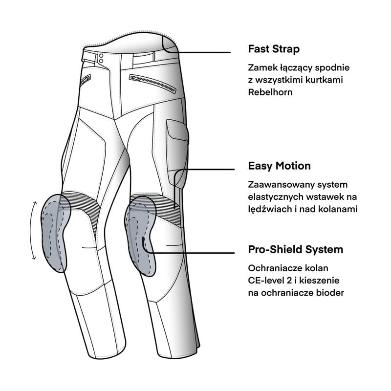 - zamki łączące typu 8VST (360° oraz krótki), dzięki którym zepniesz spodnie z dowolną kurtką Rebelhorn