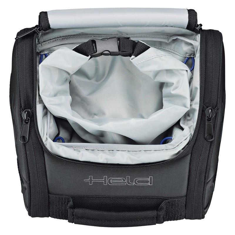 Held Vivione II to praktyczna torba tylna na motocykl wykonana z poliestru pokrytego wodoodporną powłoką, idealna do codziennej jazdy i dalszych podróży. Dzięki regulowanej pojemności i wodoodpornej wewnętrznej kieszeni zapewnia wygodę oraz bezpieczeństwo przewożonego bagażu.